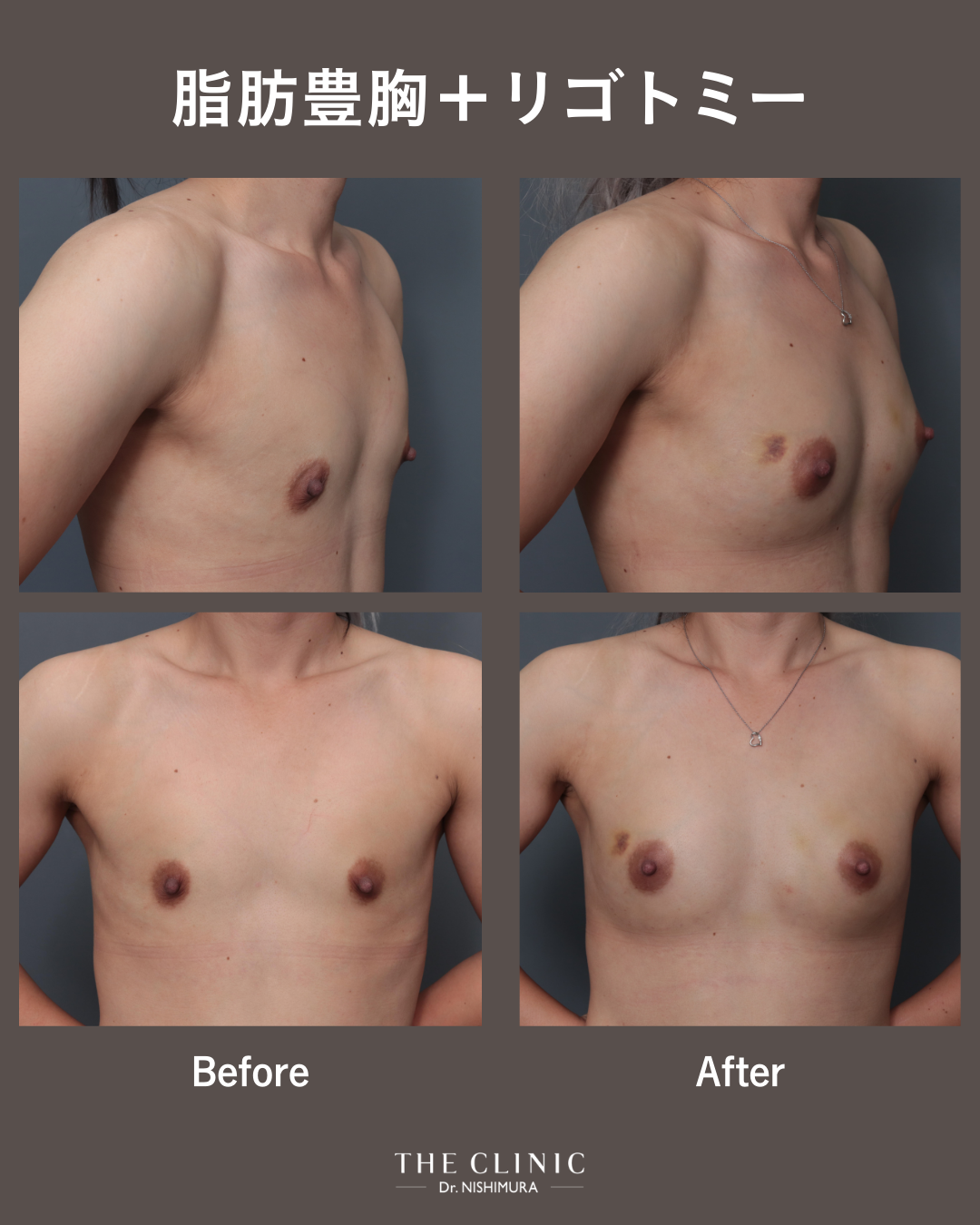 | 施術の説明 | 脂肪を、直径2.4㎜以下の細かい粒で注入する「2.4mmヌードルインジェクション技術」を使って、コンデンスリッチ豊胸を行いました。この方法は、少しの脂肪も無駄にすることなく、定着させることが可能なので、採取できる脂肪の量が少ない方に向いています。こちらのゲストも、アンダーにしっかり影ができるほど、ボリュームのあるバストに仕上がりました。 |