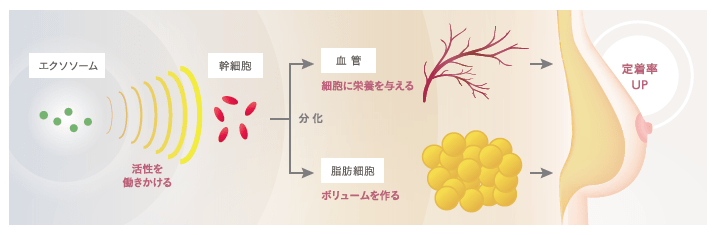 幹細胞から分泌されるエクソソームには血管や脂肪細胞への分化を促進させる作用があります。エクソソーム豊胸はその特性を活用し、脂肪の定着率と再生率の両方を向上させた豊胸術です。
