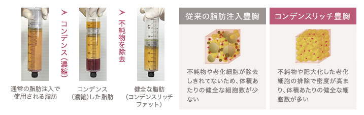 コンデンス(濃縮)技術により生成された良質な脂肪細胞(コンデンスリッチファット)だけを注入することで、しこりなど、術後のリスク回避はもちろん、高い定着率を誇る脂肪注入豊胸術です。