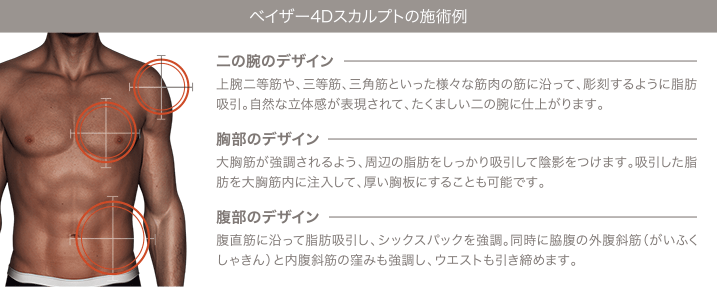 ベイザー認定医の中でも、さらに高度な技術資格「VASER 4D SCULPT」を取得したドクターのみ許される脂肪吸引施術です。割れた腹筋のシックスパック、厚い胸板、たくましい二の腕など、男性の肉体美を筋肉の動きも加味してデザインします。